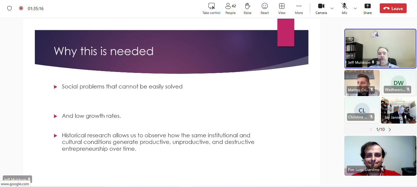 Concluding, Jeffrey Muldoon (Southeastern Louisiana University) addressed the value of history through the distinction between productive, unproductive, and destructive entrepreneurship, following the framework associated with William Baumol. He argued that entrepreneurship research often focuses on productive entrepreneurship because it is linked to innovation and growth. However, history shows that the same institutional conditions can also encourage rent-seeking or harmful forms of entrepreneurship. Historical research therefore makes it easier to see the full range of entrepreneurial activity. Muldoon used examples such as Britain’s historical development and Coca-Cola’s support for Prohibition to show that productive and unproductive entrepreneurship can exist together. These examples illustrated how historical analysis can reveal complexity that may be missed in more limited research designs. He also connected these issues to current concerns, including environmental entrepreneurship, public-private responses to social problems, and questions about low growth and institutional rigidity. His presentation showed how historical approaches can support more balanced and careful theory building.