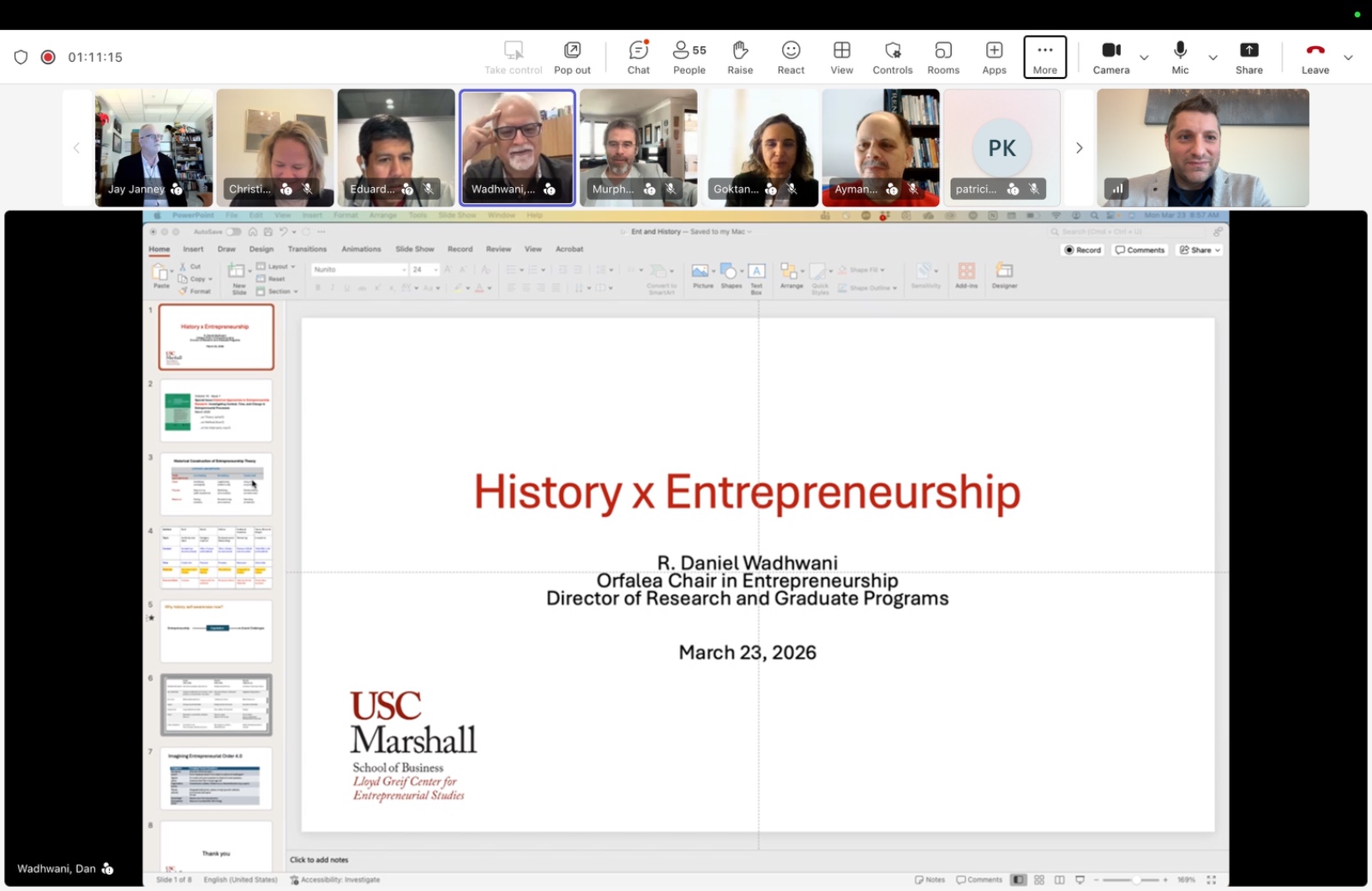 Following, Dan Wadhwani (University of Southern California Marshall) focused on the relationship between history and entrepreneurship at both a conceptual and methodological level. He distinguished between the past, meaning what happened before the present, and history, meaning the interpretation of the past in relation to present questions. This distinction was important to his argument. For Wadhwani, history is not simply a record of events. It is a way of making sense of action, process, and change. He argued that historical approaches are particularly useful for entrepreneurship because they focus attention on context and time, both of which are central to entrepreneurial action. Historical research allows scholars to study how context is formed, how time matters in practice, and how entrepreneurial action is shaped by changing conditions. Wadhwani then outlined several historical approaches that can be useful in entrepreneurship research, including socioeconomic history, cultural history, conceptual history, microhistory, comparative history, and historical case studies. A key point in his presentation was that methodological choices should follow from the research question and from the researcher’s assumptions about context, time, and entrepreneurial action. He concluded by reflecting on the history of entrepreneurship as a field. He suggested that major changes in entrepreneurship scholarship have often been linked to wider social and economic change. This raises the possibility that the field may now be entering another period of change, making historical reflection especially relevant.